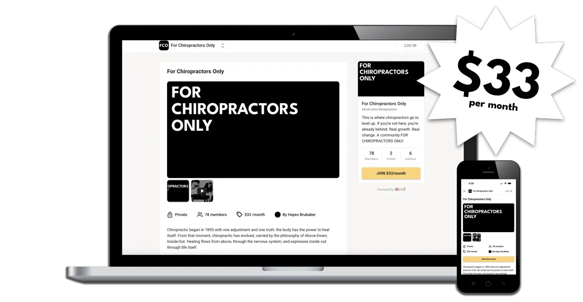 For Chiropractors Only (FCO) is a principled movement and growth platform built to reconnect modern chiropractors with the timeless foundation that started it all. It combines community and technology by uniting a private training network for mentorship and philosophy with an all-in-one software suite that handles marketing, automation, scheduling, and communication.